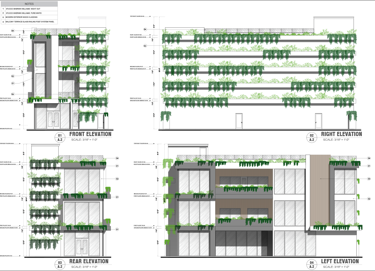 - Architecture: Complete architectural design, including floor plans for all three levels, elevations, and detailed building sections.